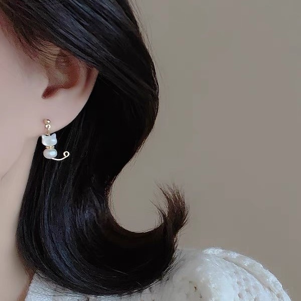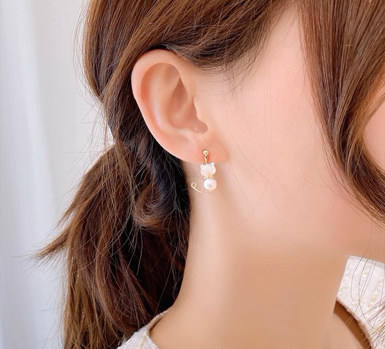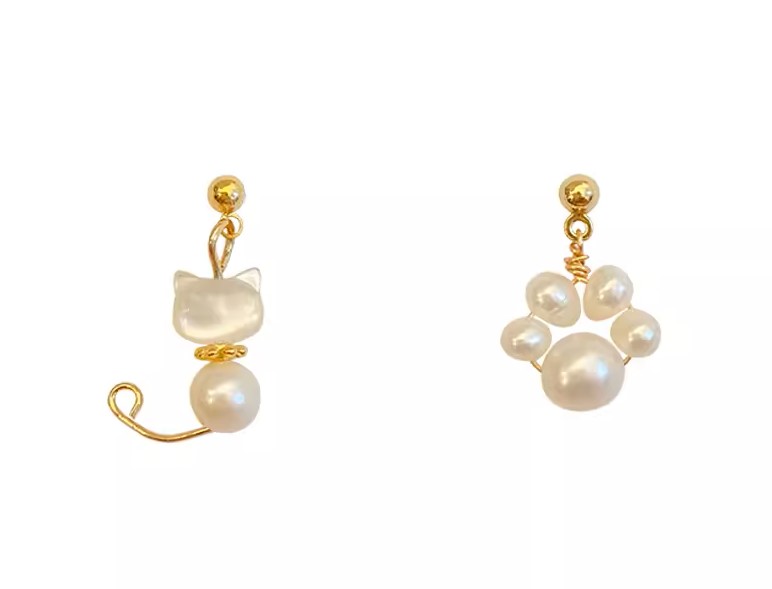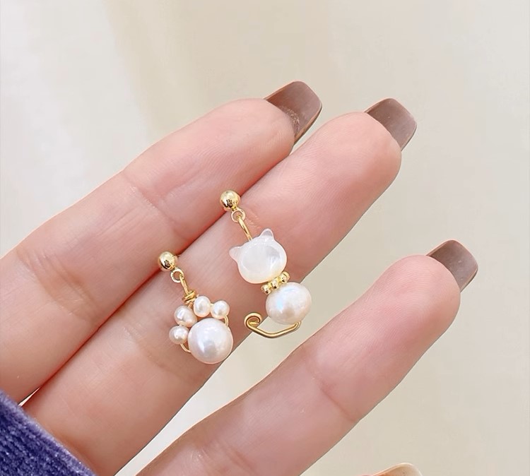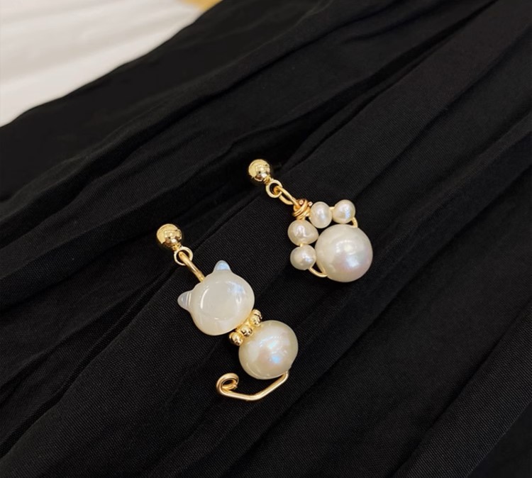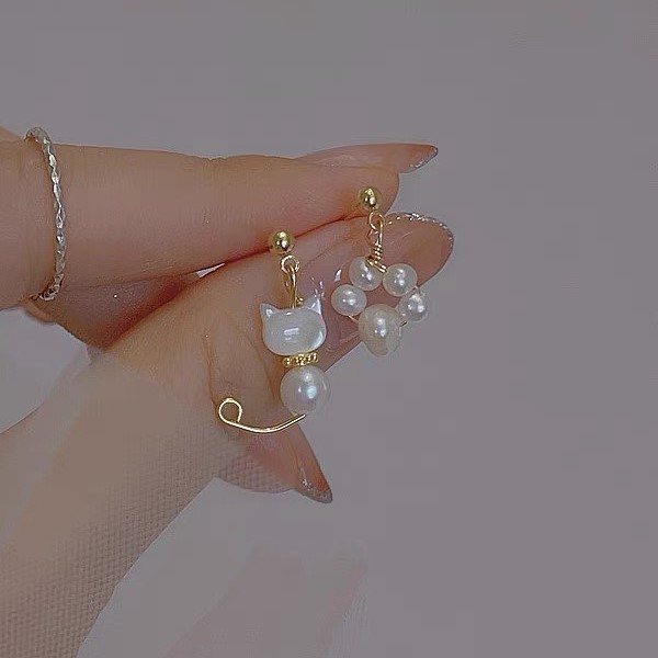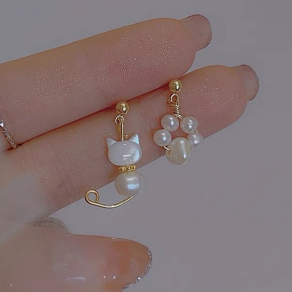 不對稱小貓咪甜美可愛珍珠925純 ...